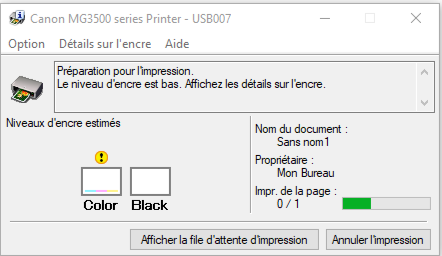 - ! → Cartouche niveau faible, impression possible.